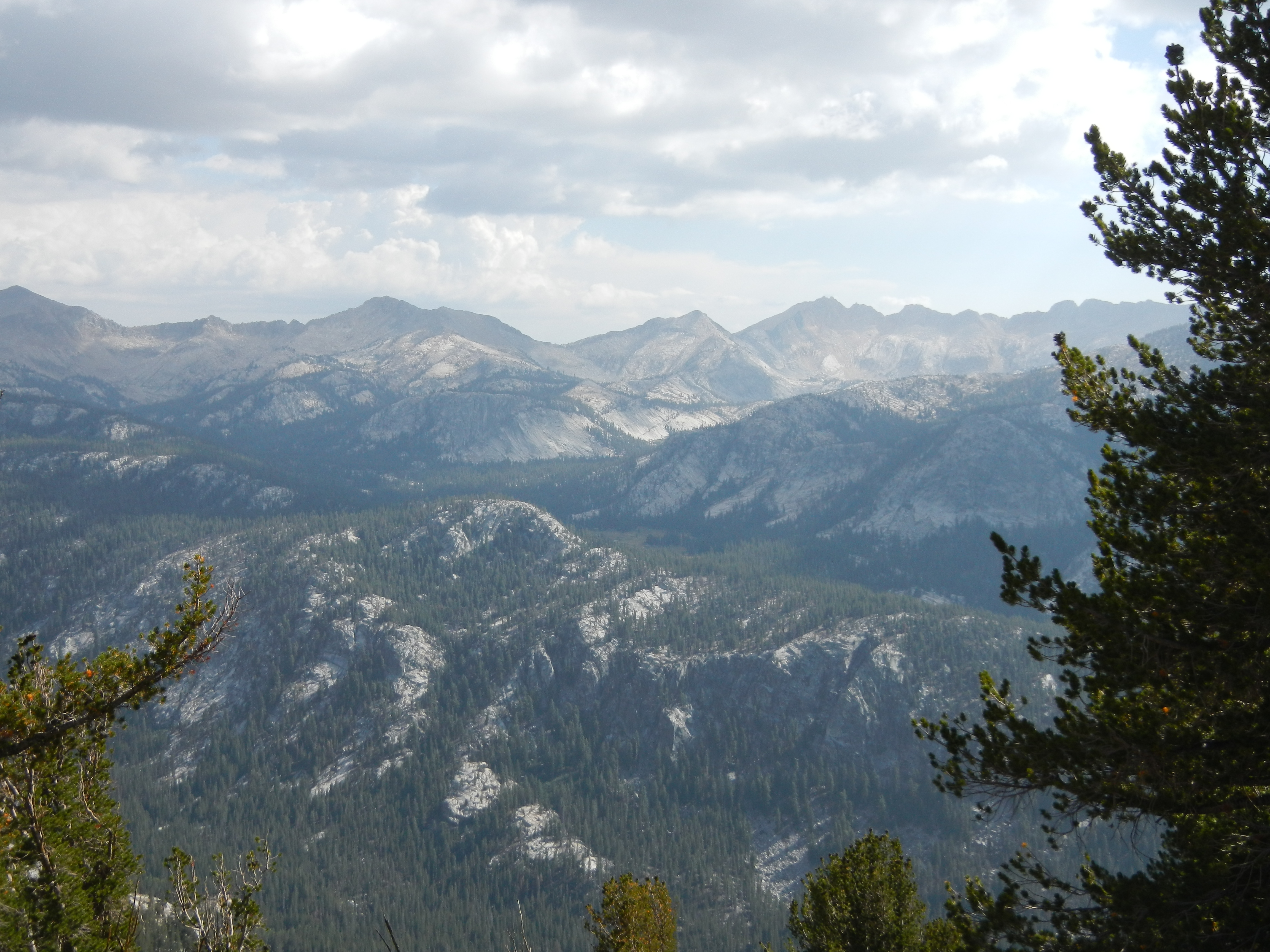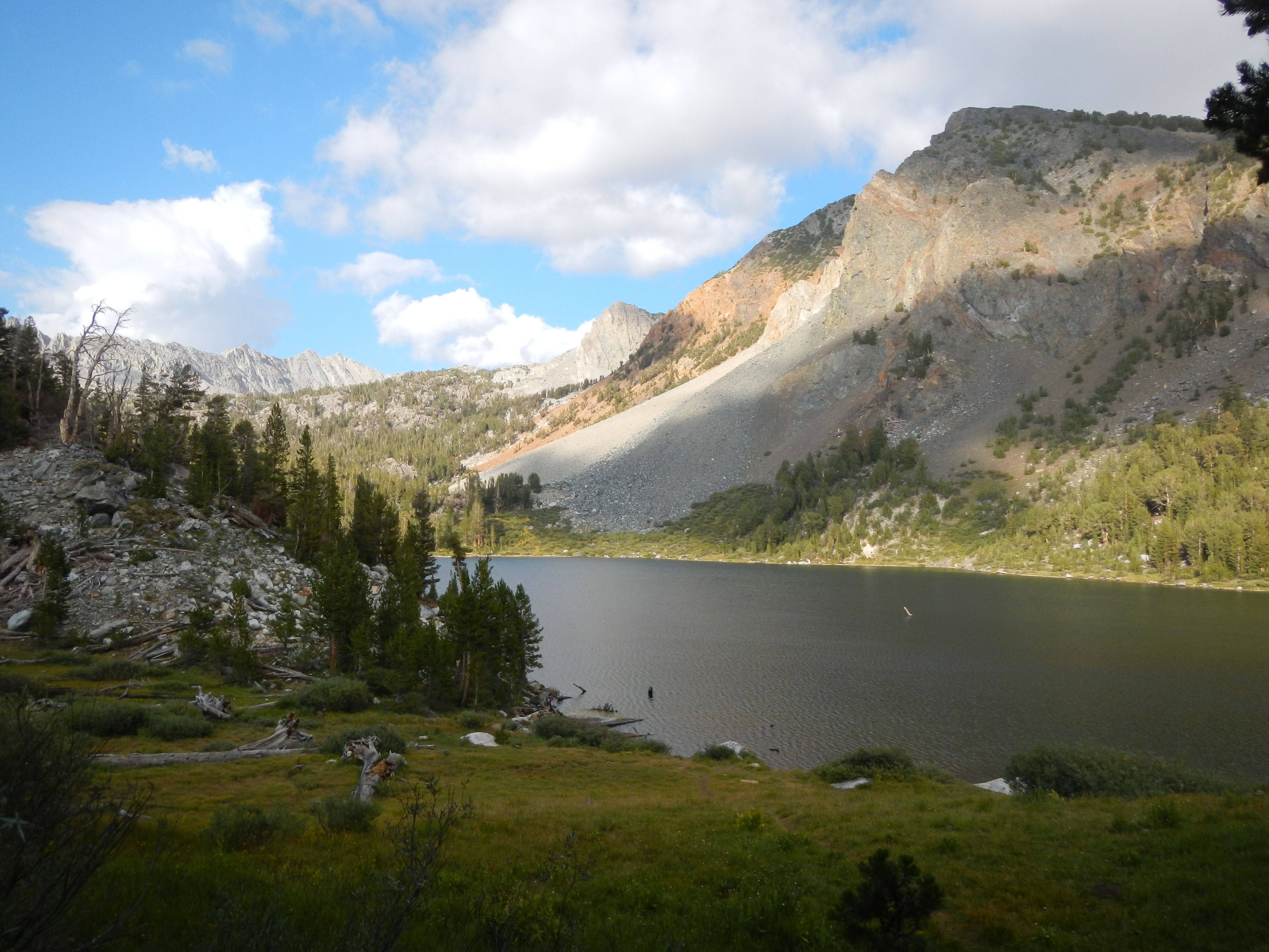 When we started hiking this morning, the sky was blue as could be, and devoid of even the hint of clouds. But the clouds have been quickly overtaking us. They are gorgeous. Not quite threatening rain, but weather moves fast up here, and I feel like it could rain. I feel good. We met a young woman on the trail named Yellie. I don’t know if that was her “real” name or a trail name. She’s hiking the JMT solo. Seems there are a lot of women up here doing that. In fact, I wonder if there are more women than men? It may be as a consequence of so many people having read Cheryl Strayed’s book, “Wild” (I read it, liked it quite a bit). It’s at least an equal balance. Yellie filled us in on another young woman who had passed us going the other direction. Turns out that she (the second woman) had been trying to hike/run 35 miles per day on the JMT. She quit and turned back because she wasn’t having any fun and everything hurt. Hmmm… I can’t imagine why!