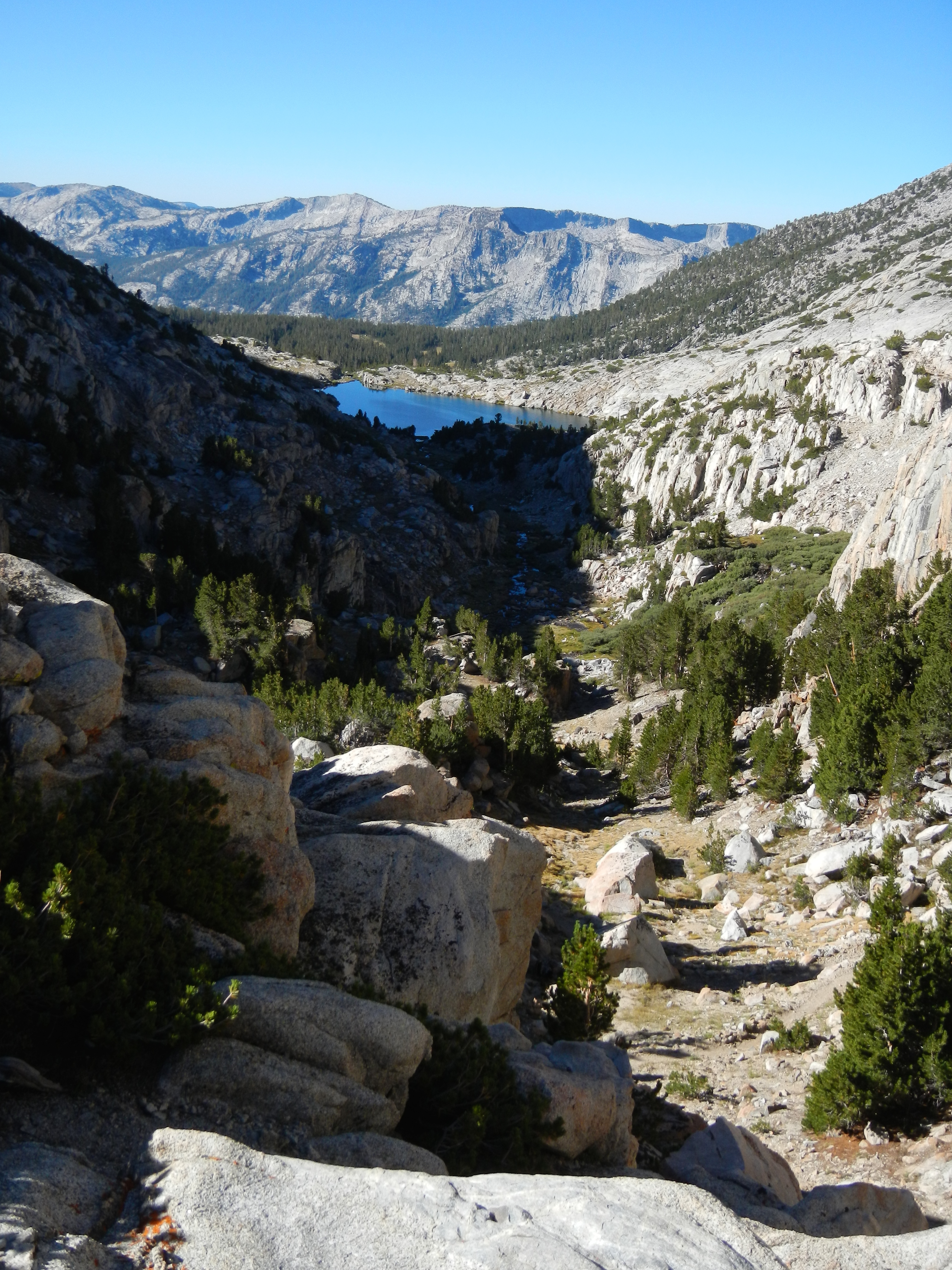 Then it was a long, long downhill trail (about 7 miles), past Sally Keyes Lakes (which, if you didn’t look at the surrounding mountains, looked very much like they could have been in northern Minnesota, surrounded by pines and just perfect for canoes).