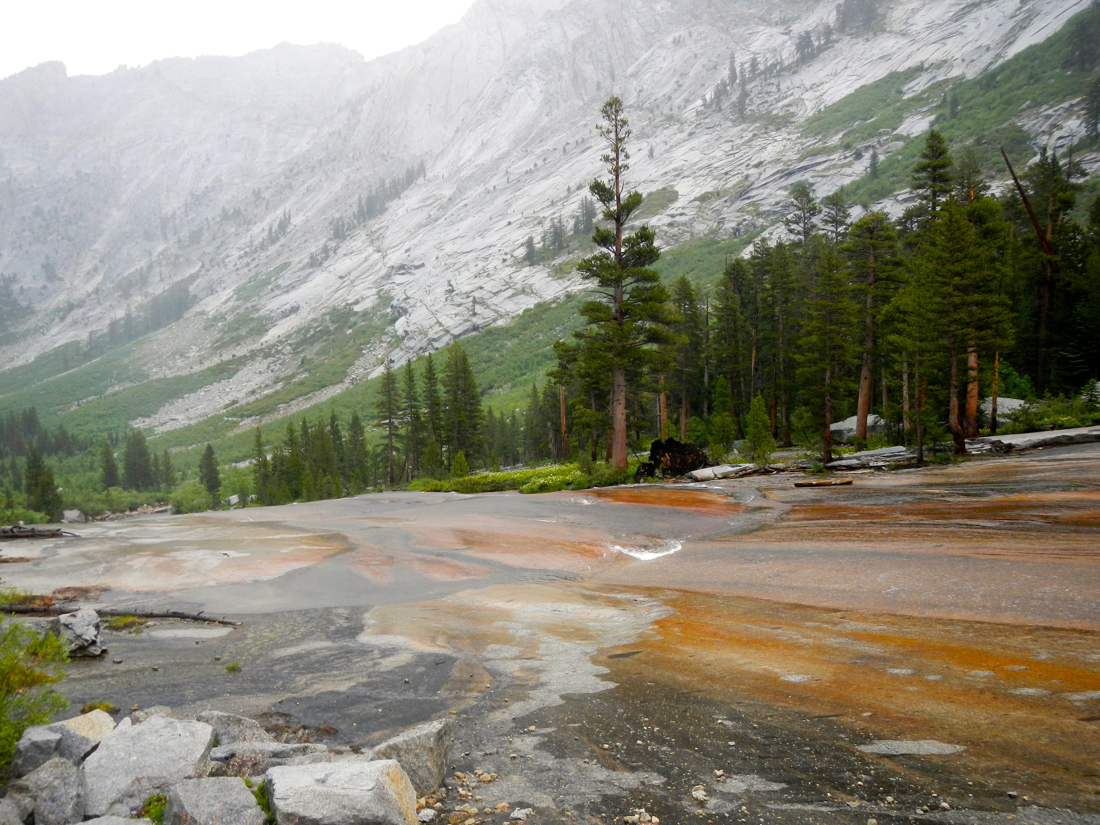 The rain stopped, the sky cleared, and by 3:00 PM the sun was out. We dried everything on the big granite boulders, and decided we should hike farther up toward the pass. We probably hiked about 9 miles today. The day became indescribably gorgeous, and the campsite we found near the wall of the canyon is spectacular. It’s in the last stand of Lodgepole before the pass. The stream is running over smooth granite slabs, and down a steep spillway (not quite a waterfall). I’d hate to slip at the top of this drop!