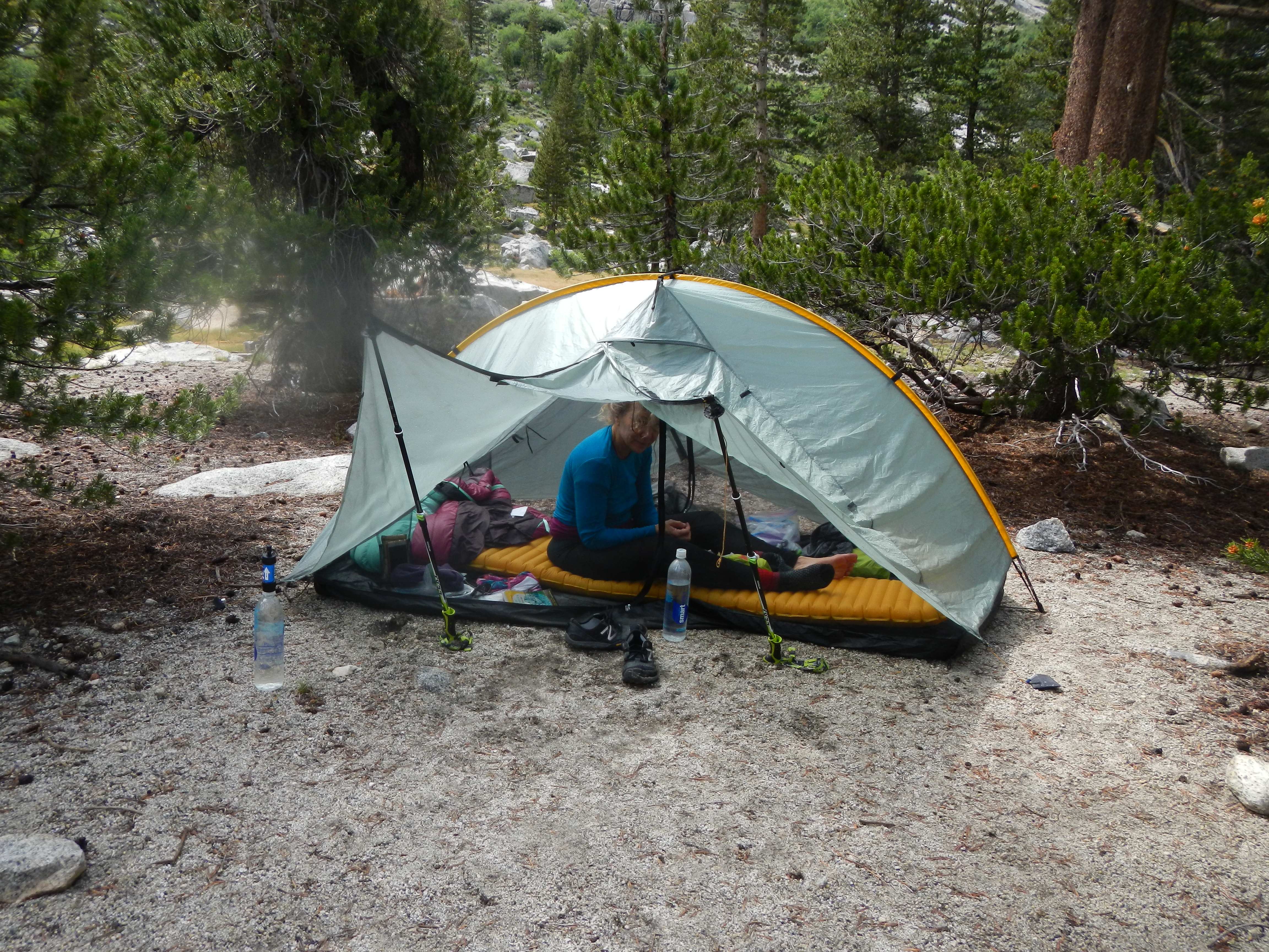 Today was like two days, with two complete camps, two tent-pitchings. I had never done that before. At the first camp, as soon as we got our tents up and got inside, the sky let loose. I love a good tent!