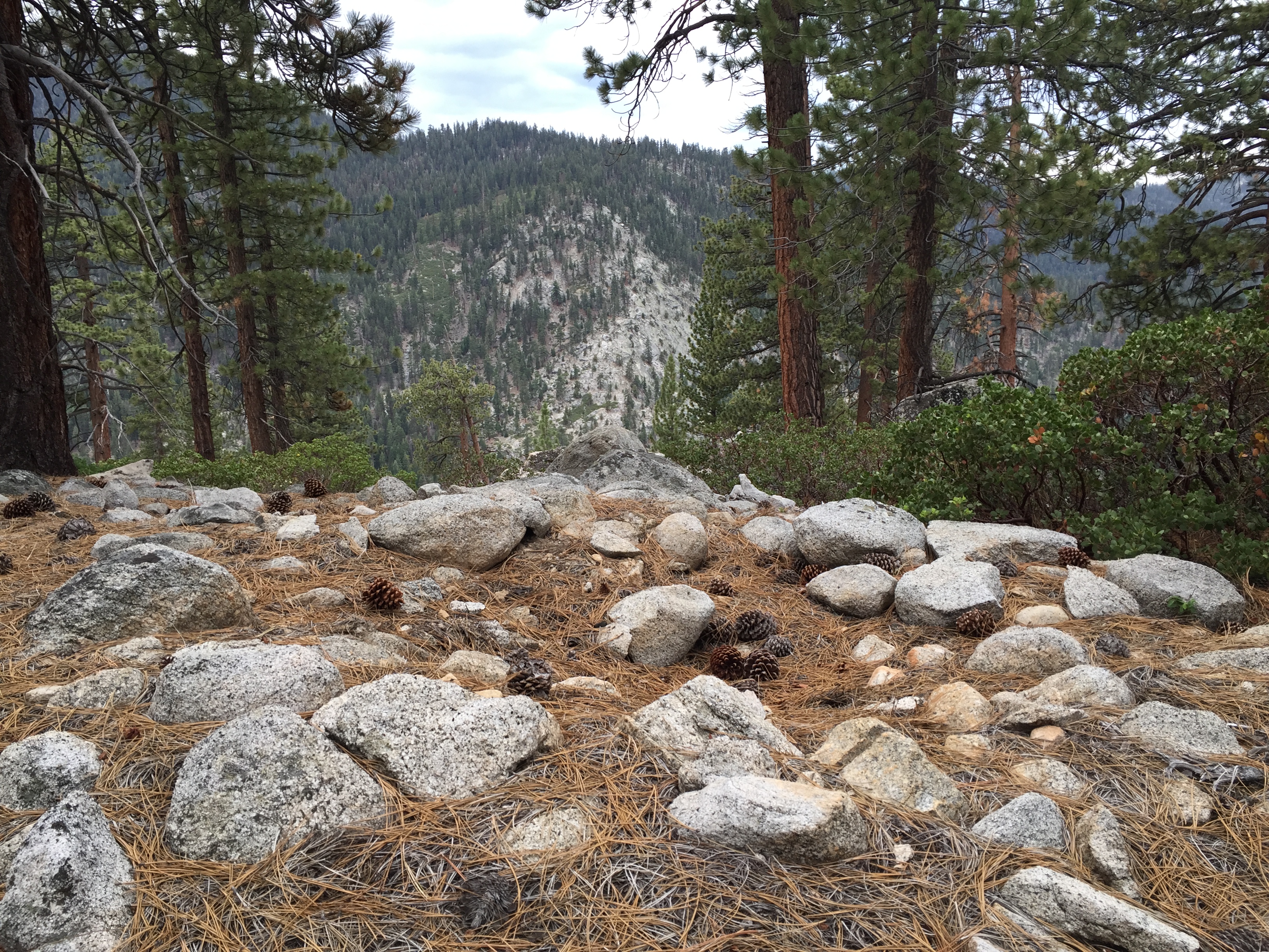 I woke again at 2:00 and at 4:00 and finally got up at 5:30. Babz and I had our breakfast of oatmeal and tea (just like John Muir!), and hit the trail at around 7:00 AM, heading over the lip of Moraine Ridge and down to Roaring River. Before we headed out, I discovered the remains of a couple of old Native American storage pits, shallow round indentations lined with rocks, perched on the lip of the ridge. I certainly can see why they would choose this area as a camp!
