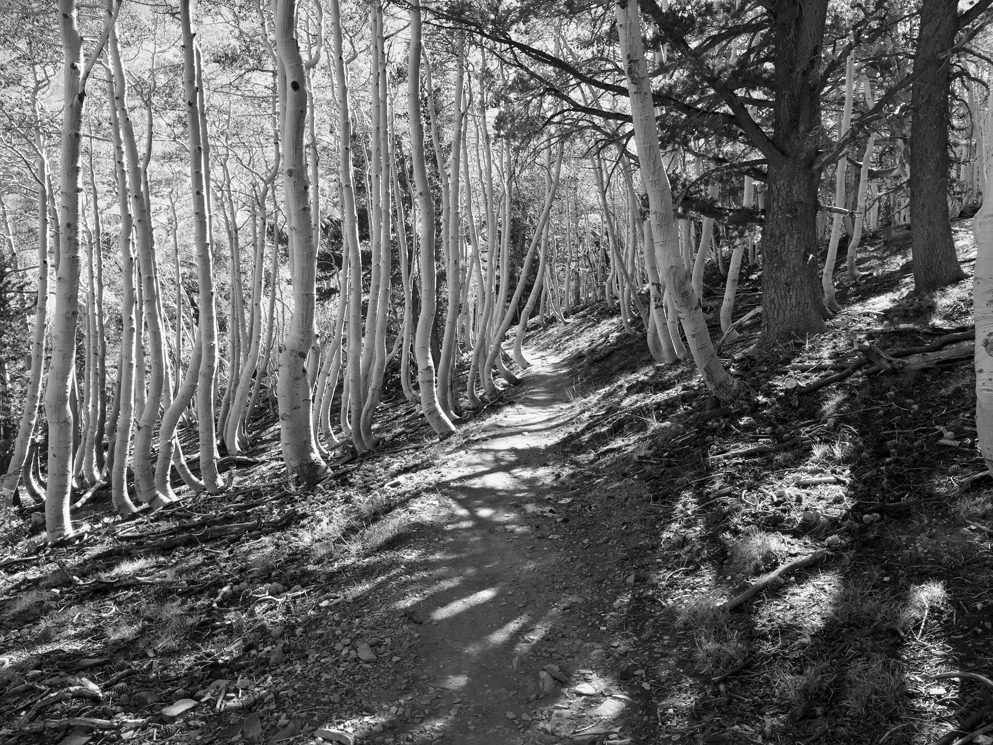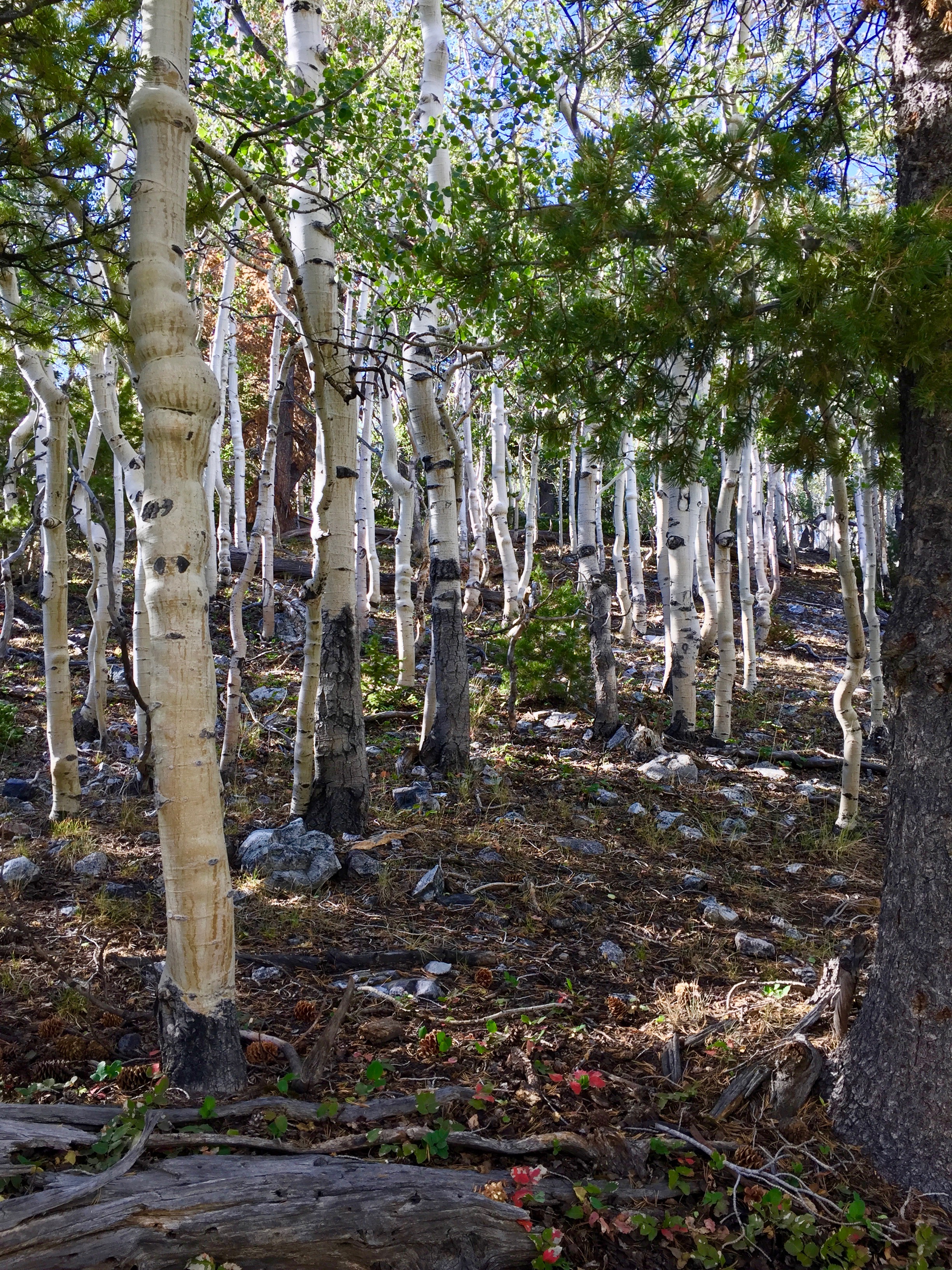 So many slender aspens, growing in an old fire zone. We could see old, decaying burnt stumps of pines scattered among them.