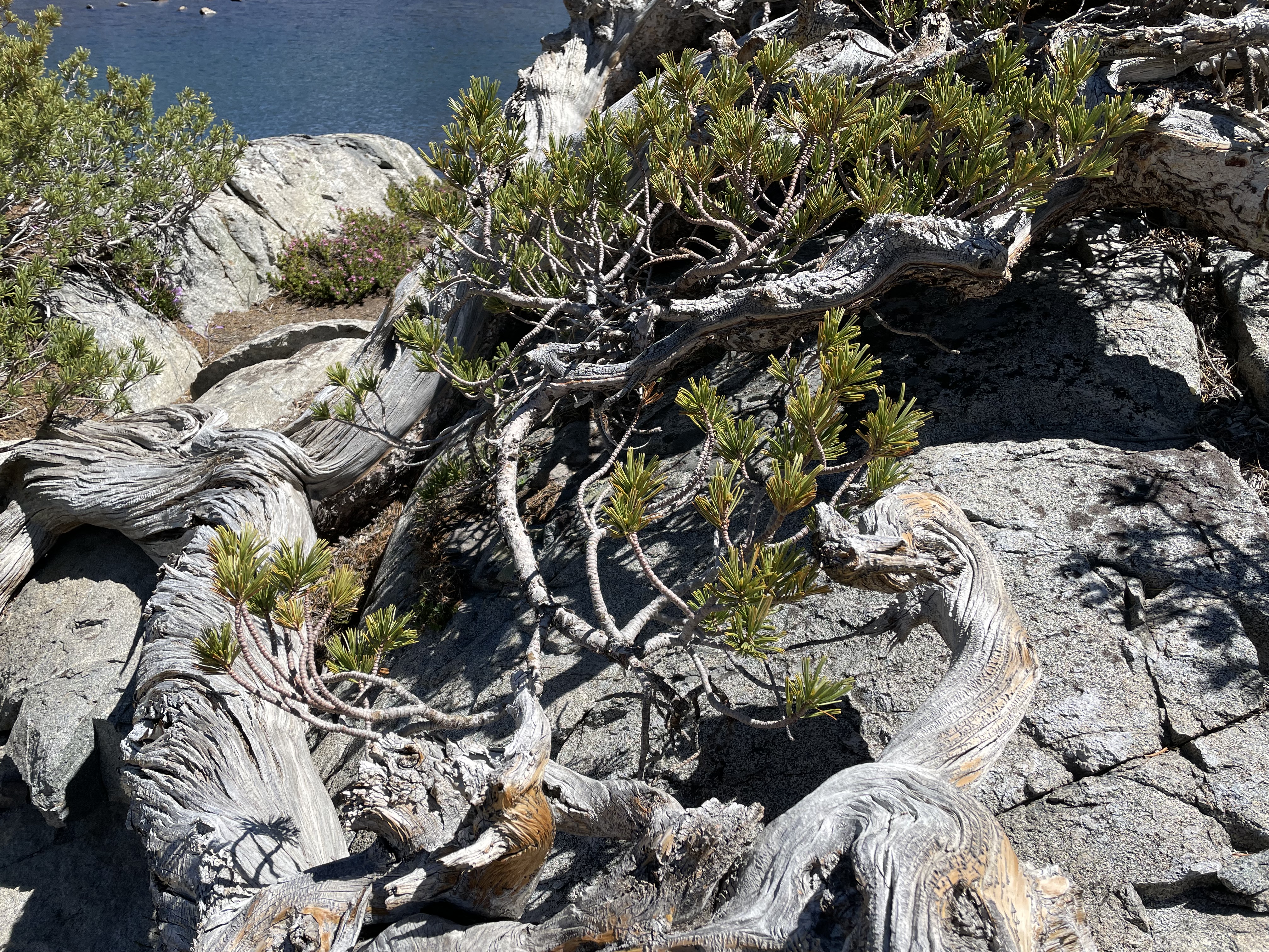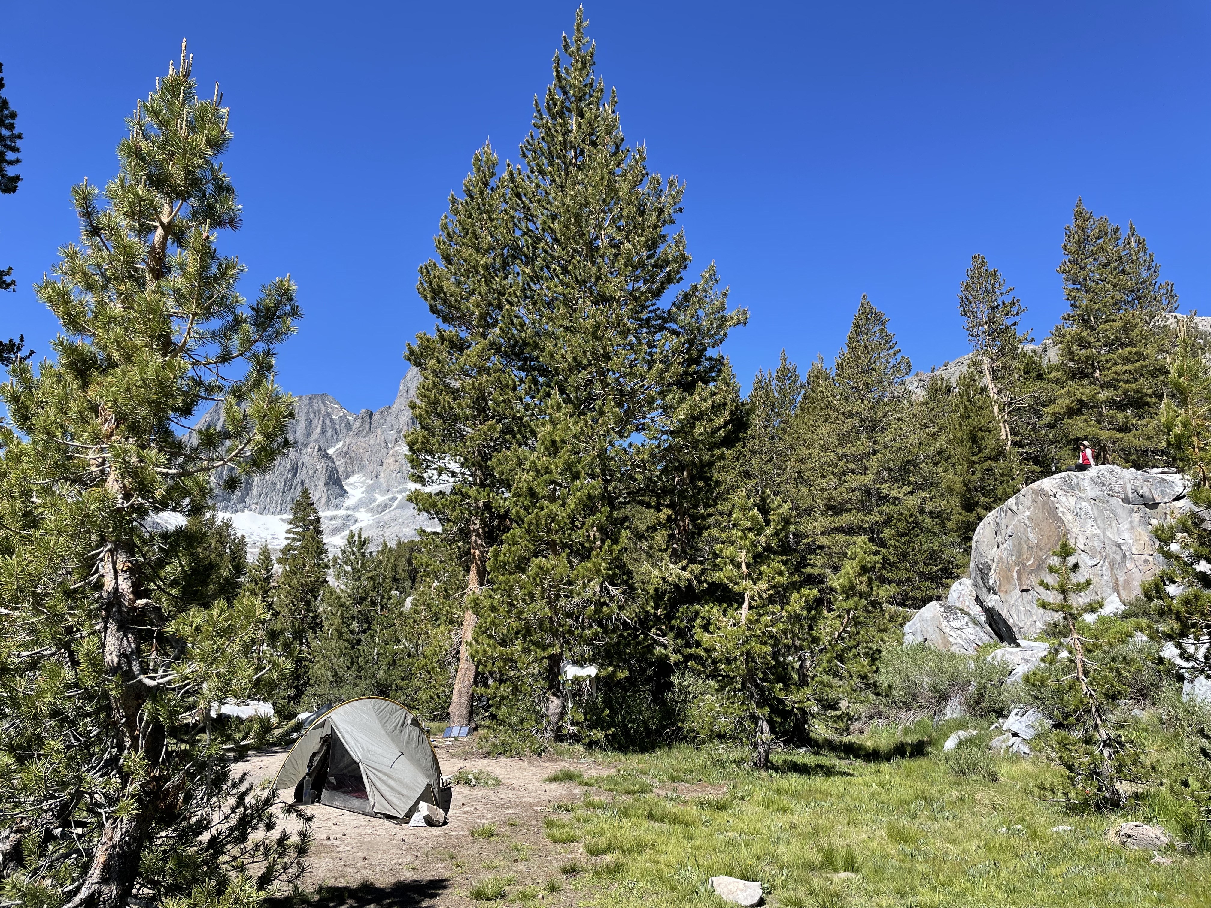 What a night! The wind started howling through the trees above us at about 9:00 PM. I thought they would abate, but they lasted almost all night, letting up at times but never being still. I am so grateful that we moved from Thousand Island Lake, where we would certainly have been blown to bits. Here, the wind stayed in the treetops, only occasionally ruffling the tents. I was reminded of hiking through a region about ten miles south of here while on the JMT, where an entire swath of forest was felled by a “freak” wind event not that many years ago. like a mini mountain cyclone. Could it happen here? Can these trees around us withstand the force? Last night, they held, for which I am grateful.