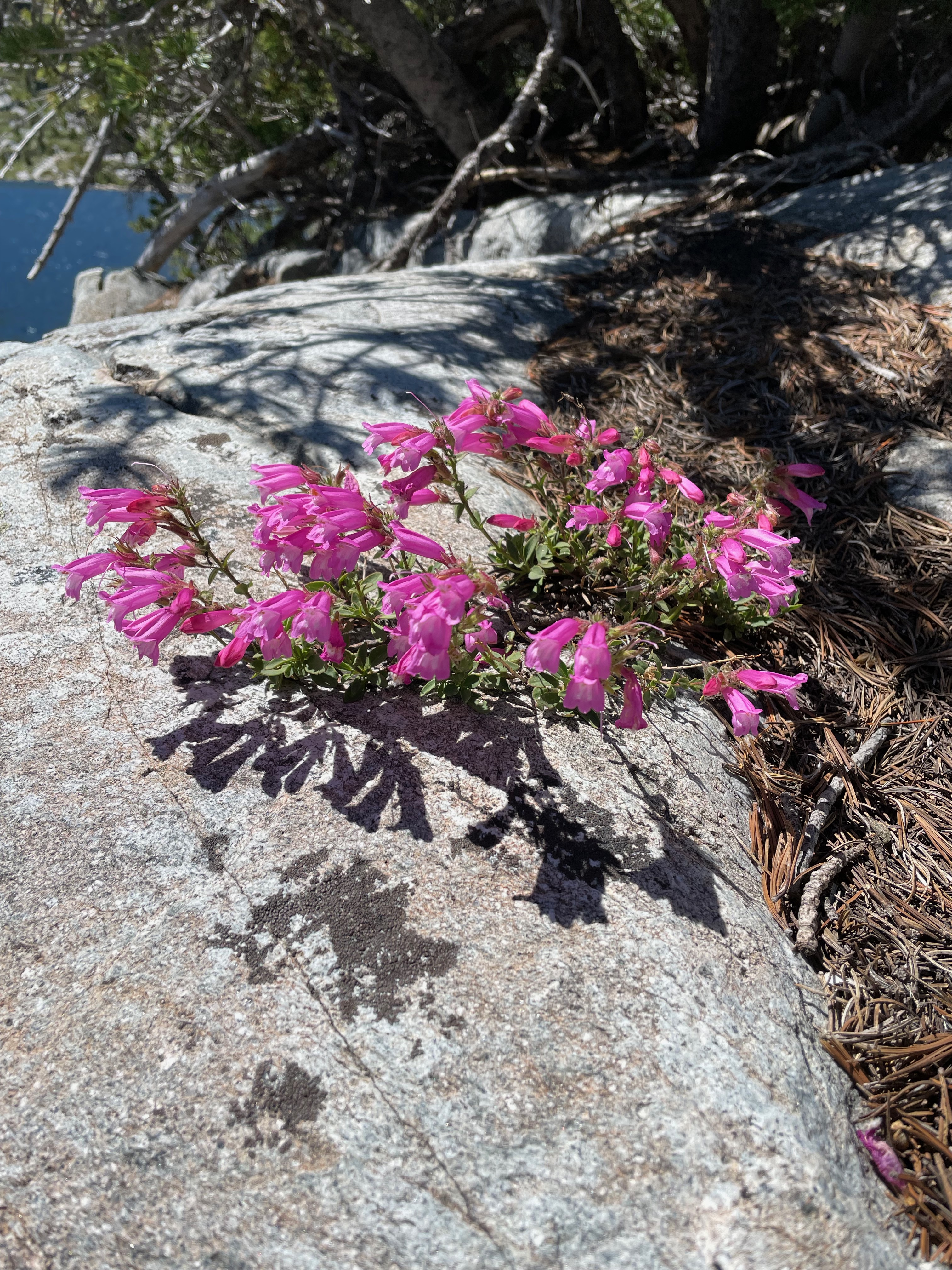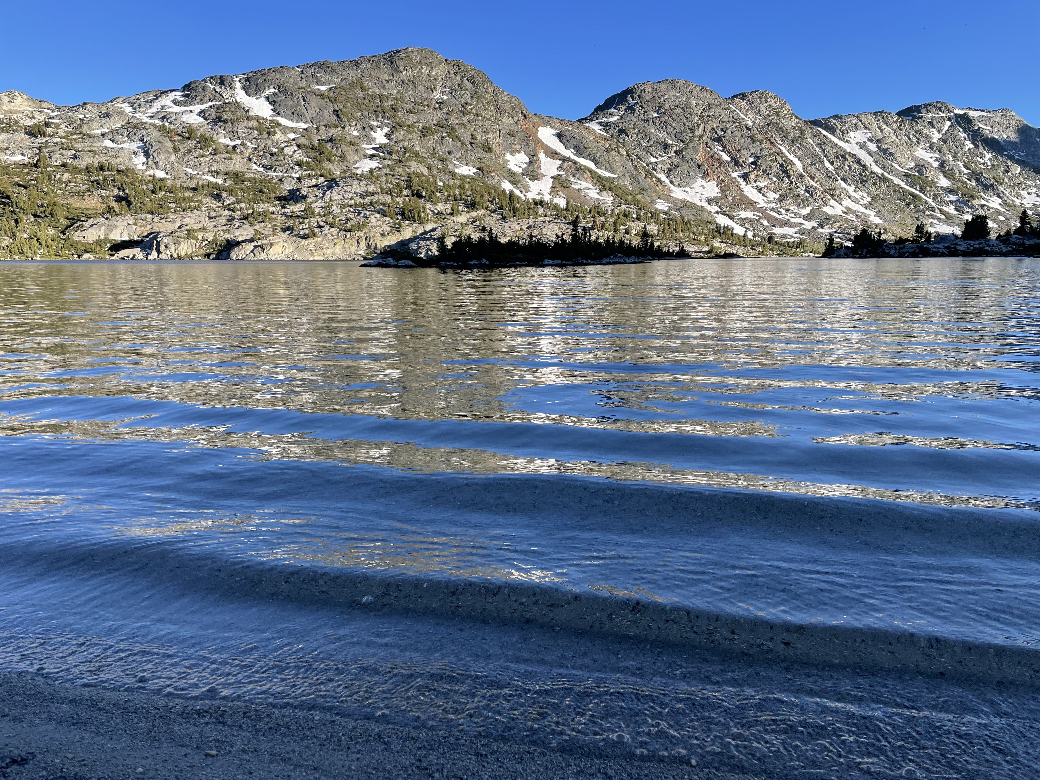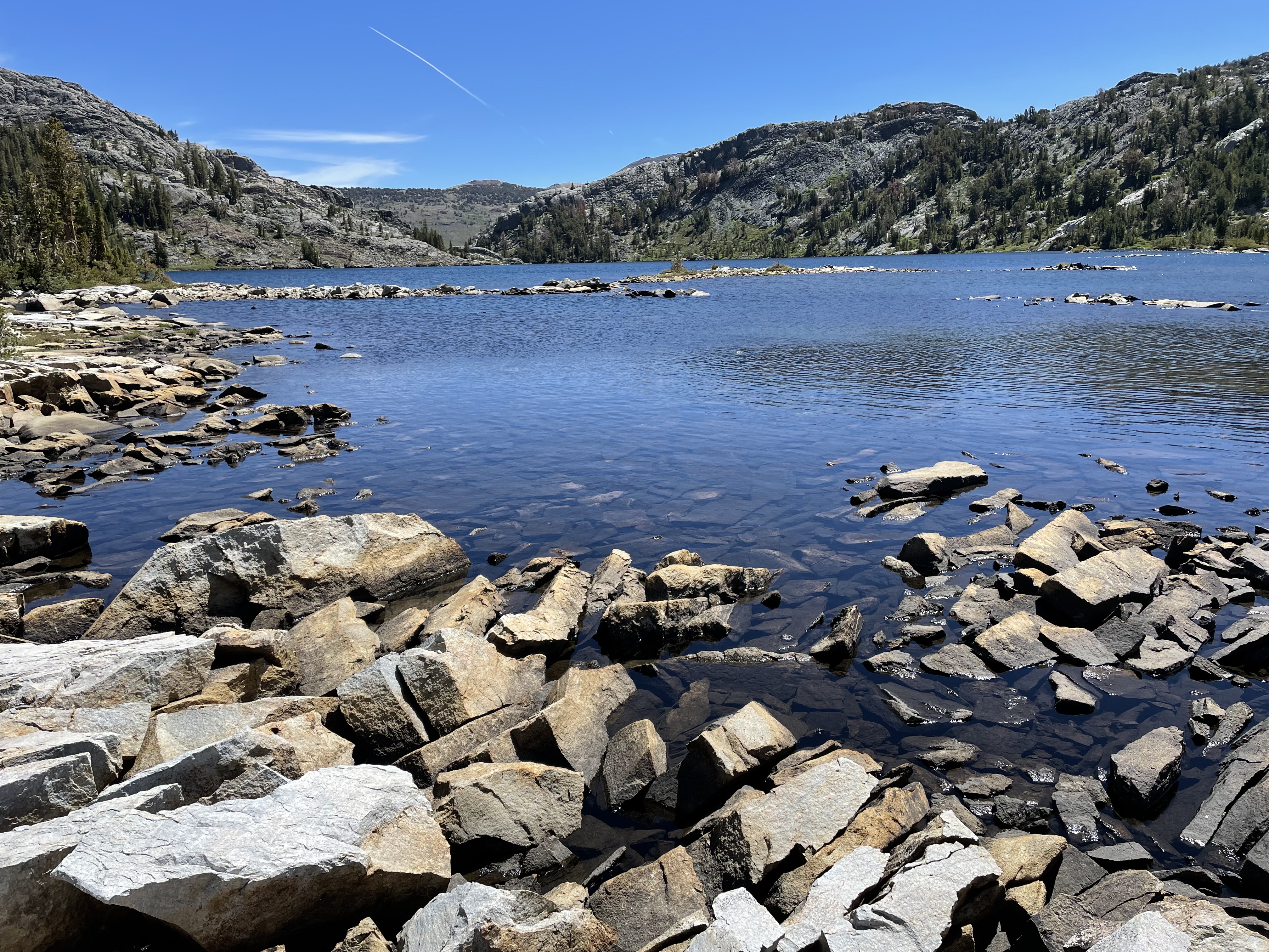 There is a couple camped not too far from us, on a gorgeous rocky peninsula. They have a two-person Tarp Tent and a Bearikade. They must be Californians. I have yet to see them at their campsite or around the lake.